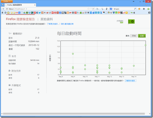 原來我每次打開 Firefox 的平均啟動時間大概 2.5 秒,這個月出現了 14 次的程式錯誤(咦?好像沒有那麼多?),並且使用 Firefox 共 94100 分鐘(哇!這也太誇張,是不可能任務了吧!)。這是今天 Firefox 21 正式版提供的瀏覽器健康檢查報告,幫助我們了解與回報 Firefox 的效能與問題。
